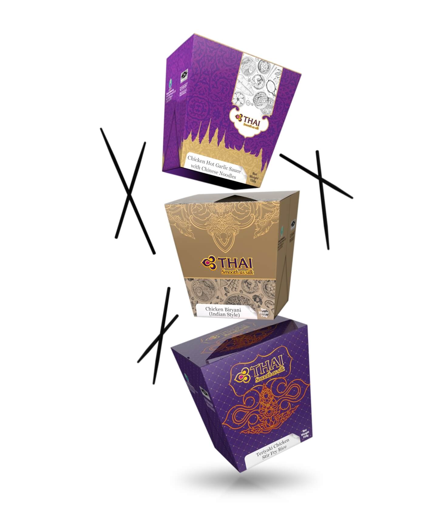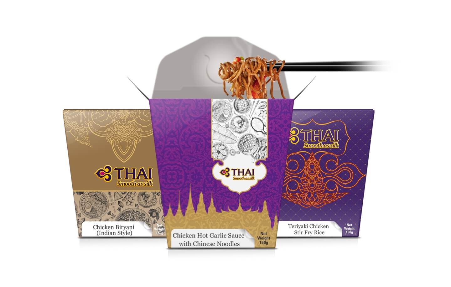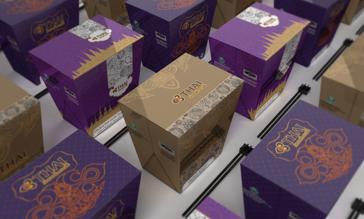 The packs were designed with rich and bright colours with special attention to the overall balance and aesthetics. The idea was to make them look welcoming and mouth watering without actually showing any food images. The classy Thai motifs and illustrations gave a strong indication of the land and the culture. The white strip at the bottom was a functional solution to change the name of the cuisine from time to time.