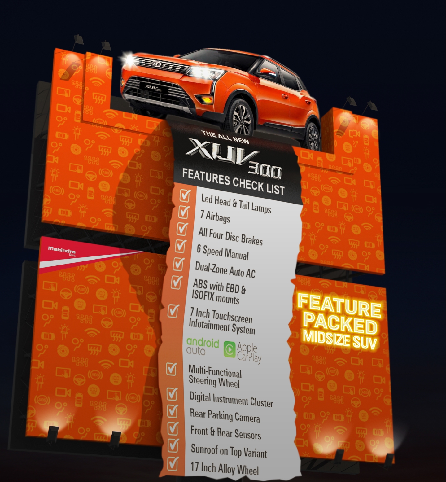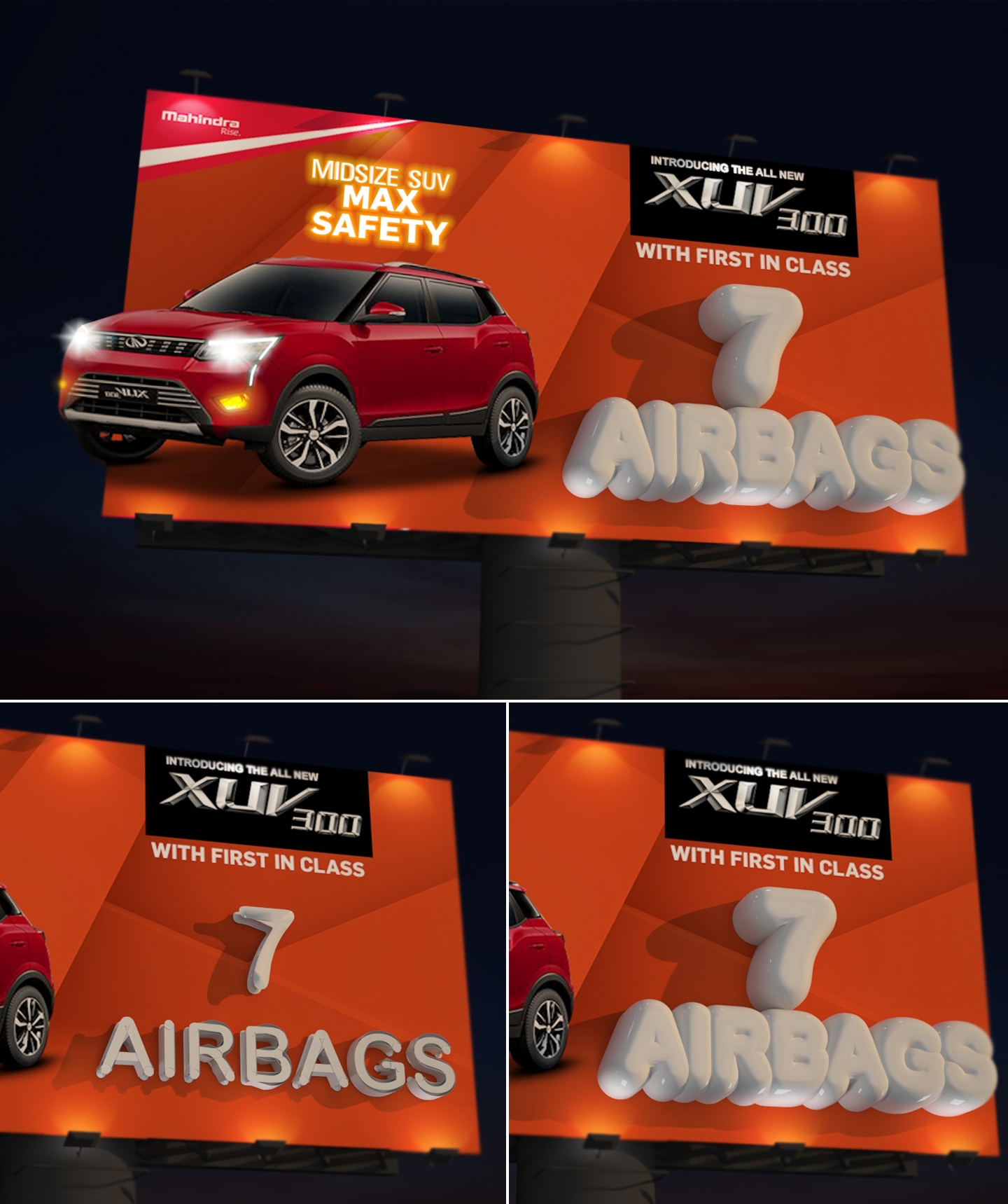 Apart from the traditional forms of advertising Mahindra & Mahindra were looking for some disruptive outdoor ideas for the launch of their new midsize SUV-XUV300. They wanted the innovation concepts to highlight two key features which were first in class- (1) Maximum safety with 7 airbags (2) Long list of features.
