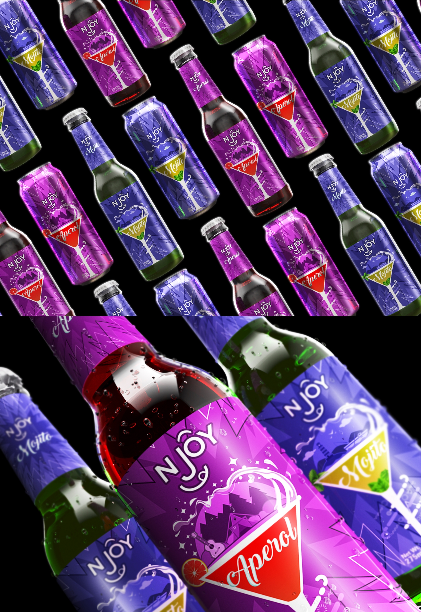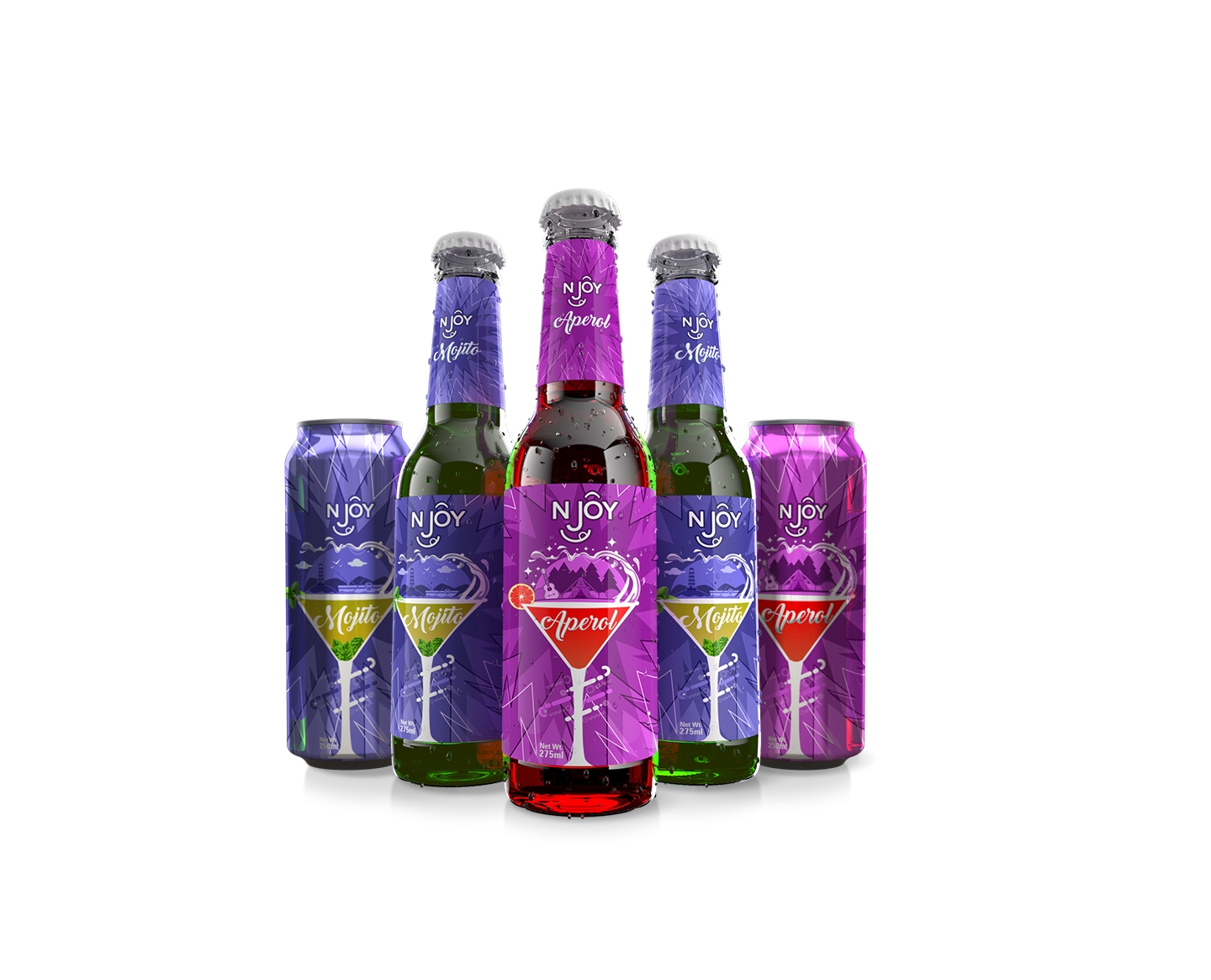 Njoy was introducing a range of cocktail drinks. They needed very happy, bright and colourful design concepts that depicted; adventure, relaxation and good time. The happiness had to be communicated with the logo and the packaging alike. The ‘Target Audience’ were predominantly the youth and the party goers but the approach had to be generic irrespective of age group or gender.