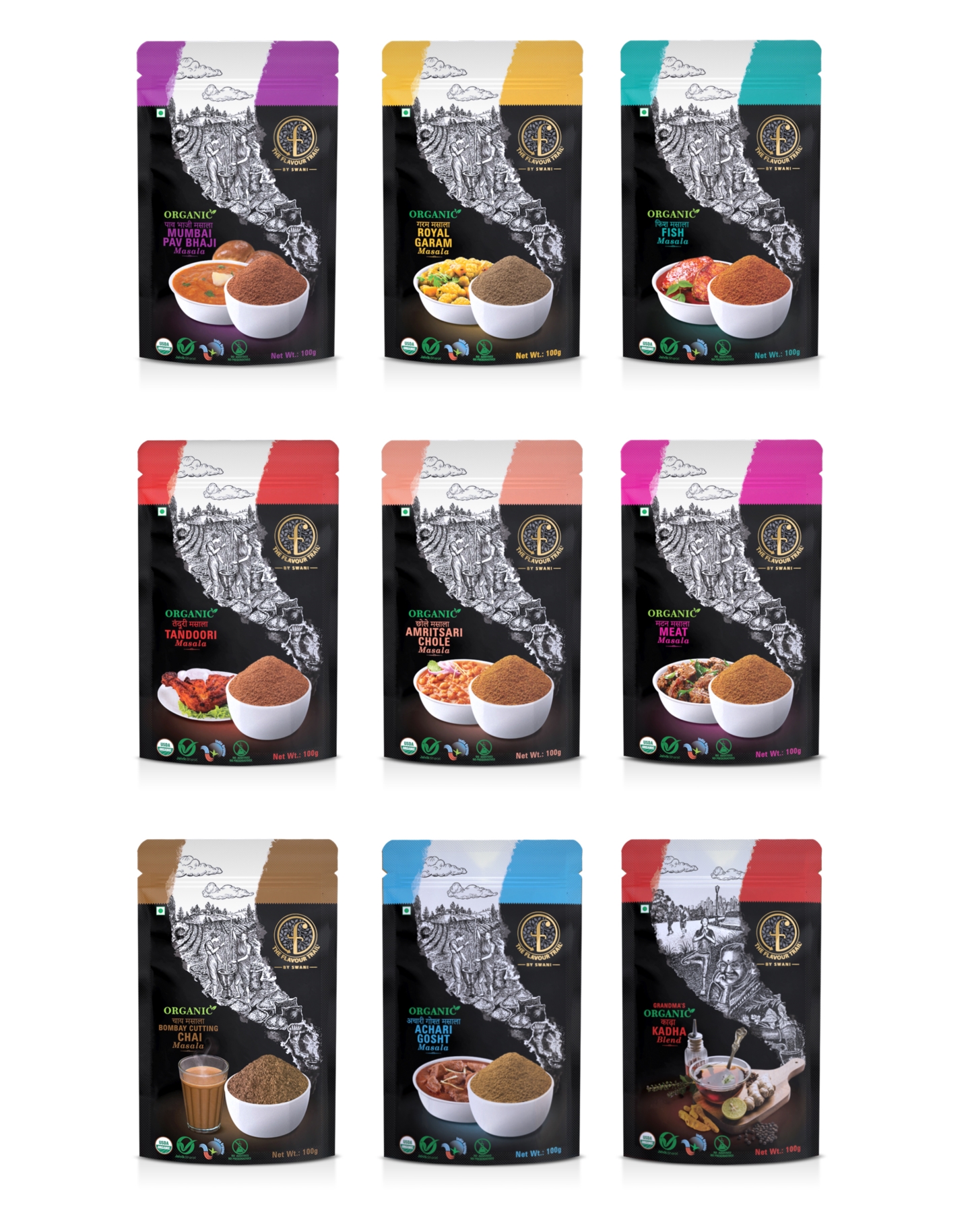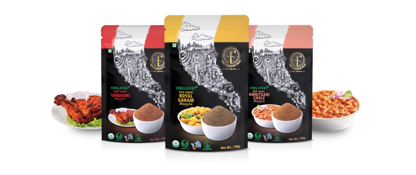 The Flavour Trail by Swani is a brainchild of the Swani Group, founded in 1864. Their range of organic spices, seeds and blends are pesticide-free, sustainably farmed, hygienically processed and steam sterilised to meet the global food safety regulations. With this new brand, the parent company wanted to step into the retail business for the first time. They wanted their brand to look premium and distinctive from the other brands. The look had to be striking, creative and engaging.